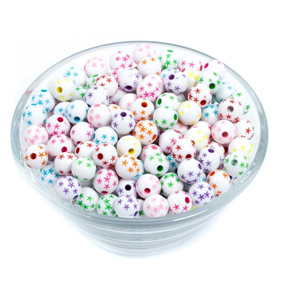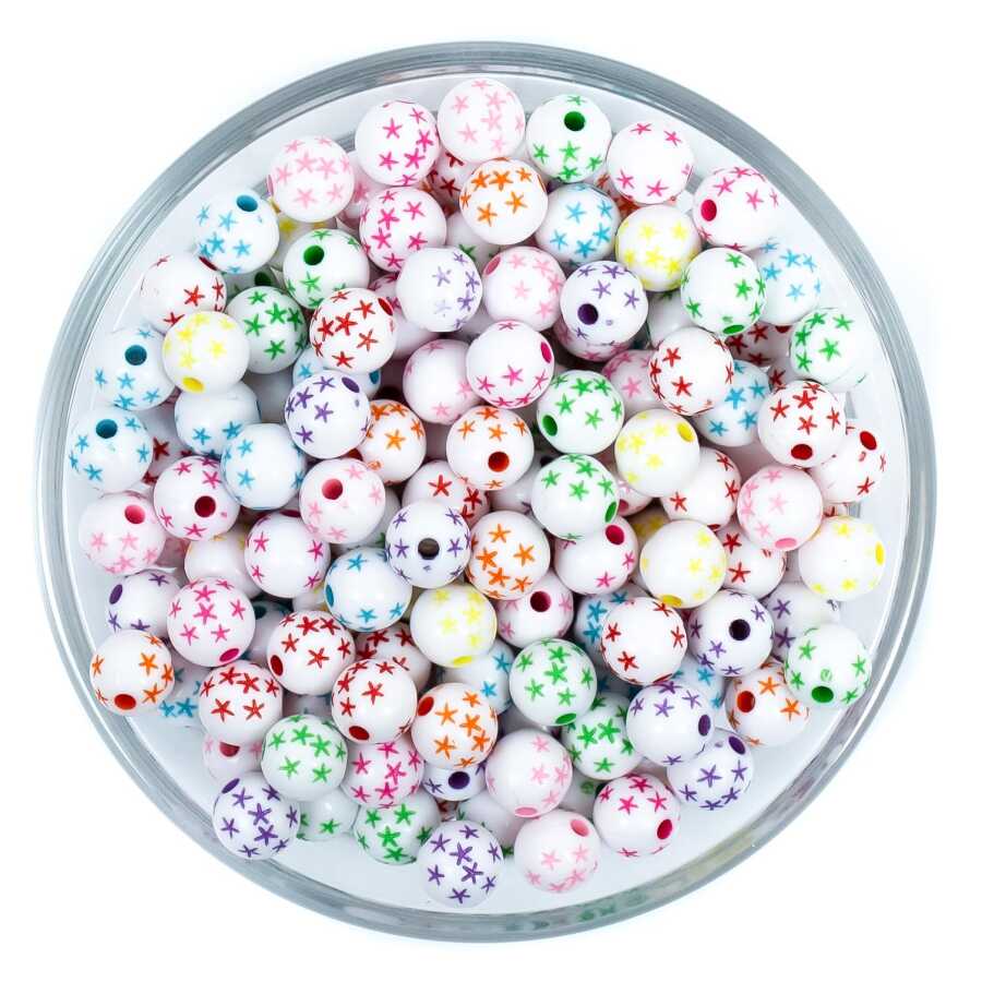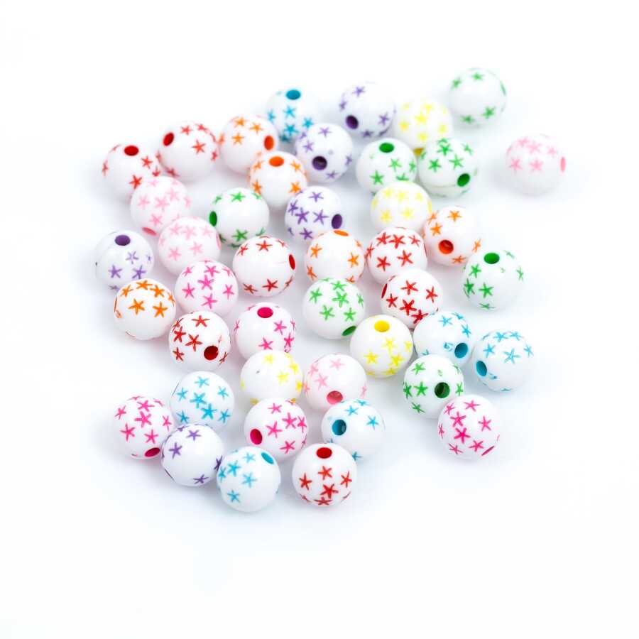 25 Gram - 8 mm Karışık Renk Yıldızlı Desenli Yuvarlak Plastik Boncuk, 1. Kalite Boncuk, (25 gram - 83-88 Adet)