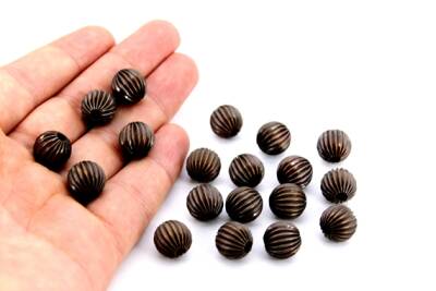 4 Adet - 12 mm Çizgili Misket, Metal Boncuk, Antik Bakır Kaplama